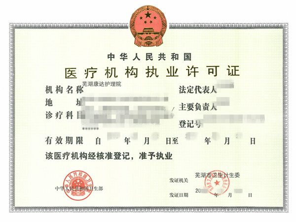 蕪湖康達護理院衛(wèi)生許可證正本