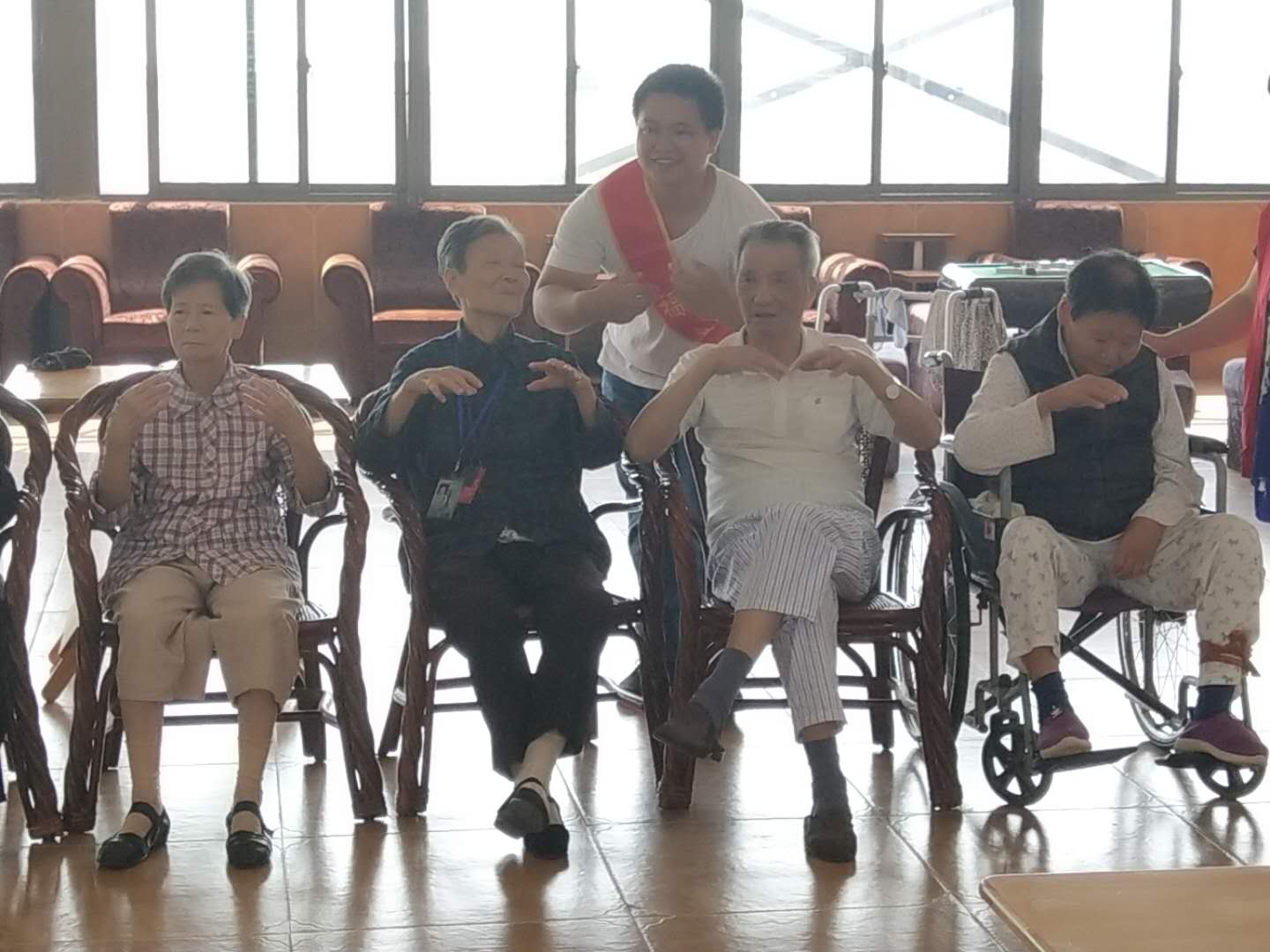 主持人在教老人們做手指操,測試他們誰的反應(yīng)能力快。
